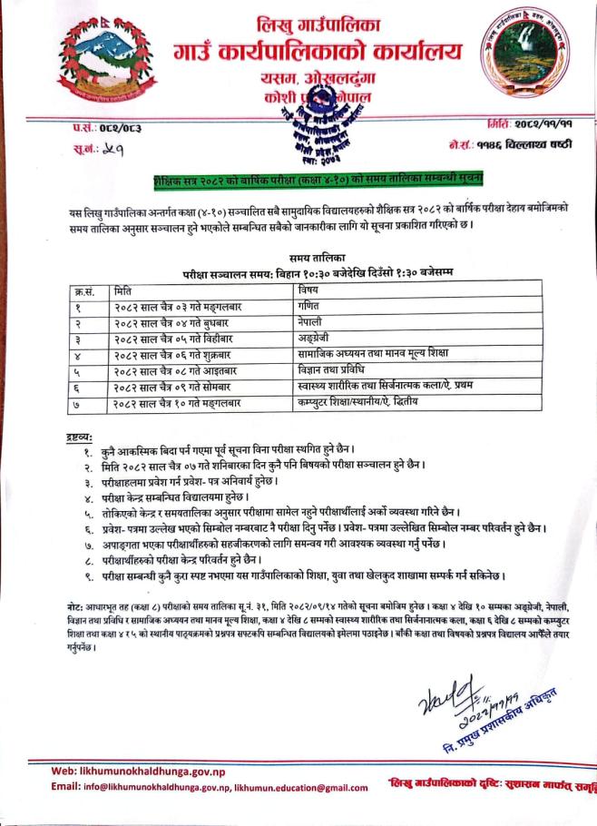 शैक्षिक सत्र २०८२ को वार्षिक परीक्षा (कक्षा ४-१०)को समय तालिका सम्बन्धी सूचना !!!