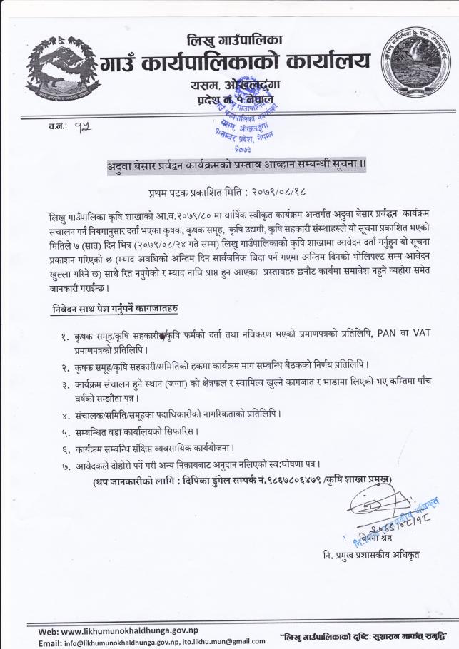 अदुवा बेसार प्रवर्धन कार्यक्रमको प्रस्ताव आव्हान सम्बन्धी सूचना ।