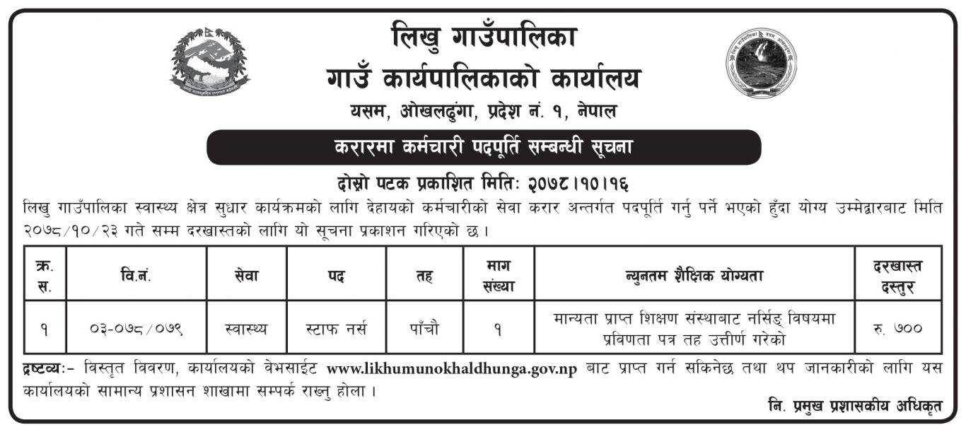 करारमा पदपुर्ति सम्बन्धी दोस्रो पटक प्रकाशित सूचना (स्टाफ नर्स) ।