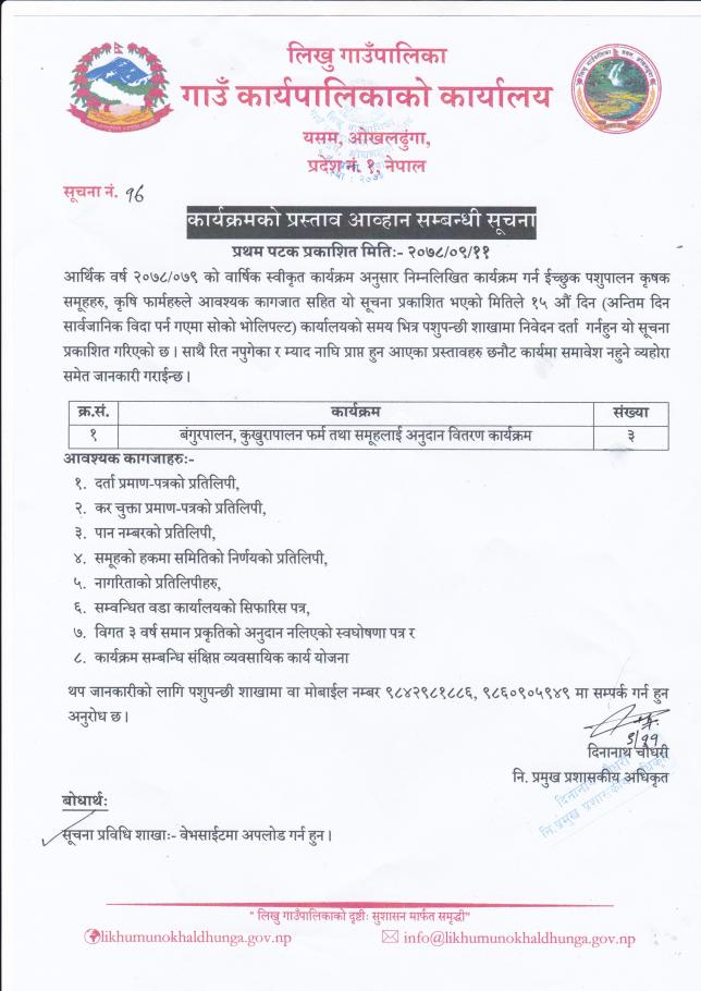 विभिन्न कृषि तथा पशुपन्छी कार्यक्रमहरुको प्रस्ताव आह्वान सम्बन्धी सूचना !!!