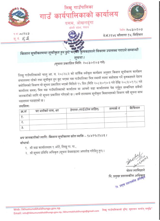 किसान सूचीकरणमा सूचीकृत हुन छुट भएका कृषकहरुले विवरण उपलब्ध गराउने सम्बन्धी सूचना ।।।