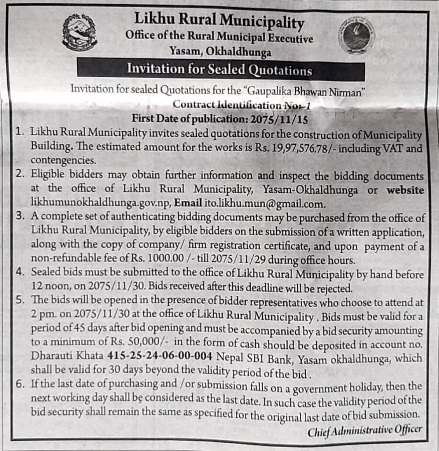 गाउँपालिका भवन निर्माण सम्बन्धि सिलबन्दि कोटेसन आब्हानको सूचना ।