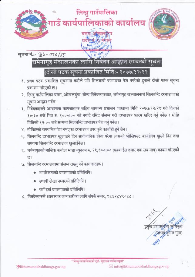 चमेनागृह सञ्चालनका लागि निवेदन आव्हान सम्बन्धी सूचना (दोस्रो पटक प्रकाशित)।