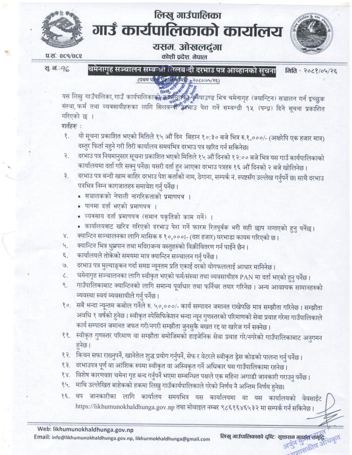 चमेनागृह सञ्चालन सम्बन्धी सिलबन्दी दरभाउ पत्र आव्हानको सूचना !!!