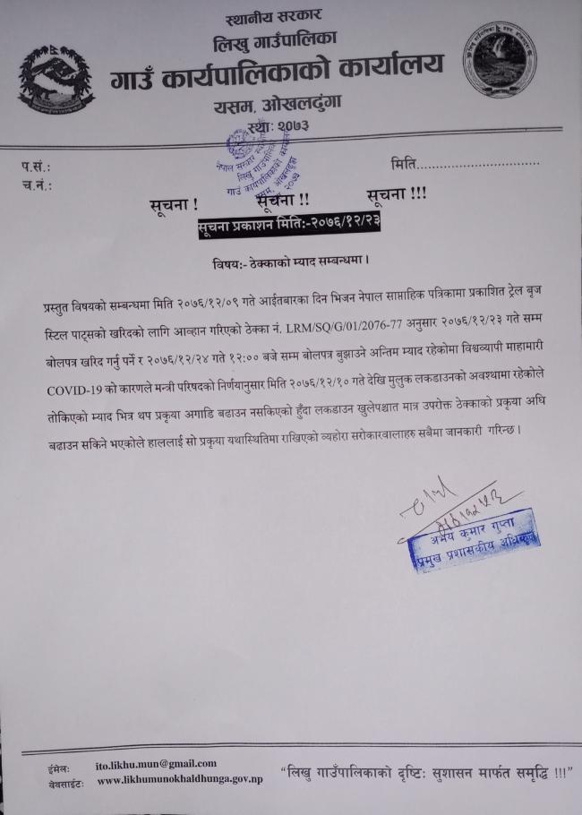 » ठेक्का नं. LRM/SQ/G/01/2076-77 को म्याद सम्बन्धमा ।