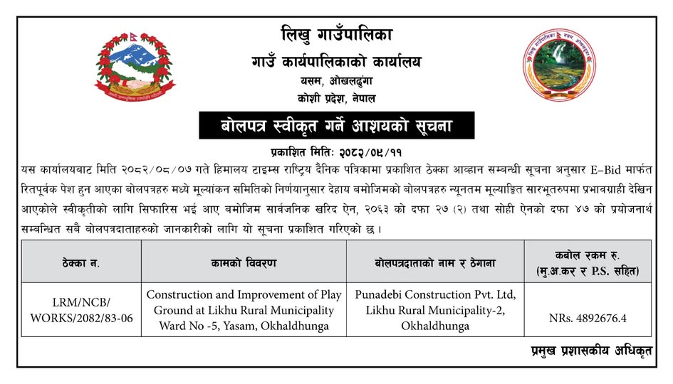 बोलपत्र स्वीकृत गर्ने आशयको सूचना !!!