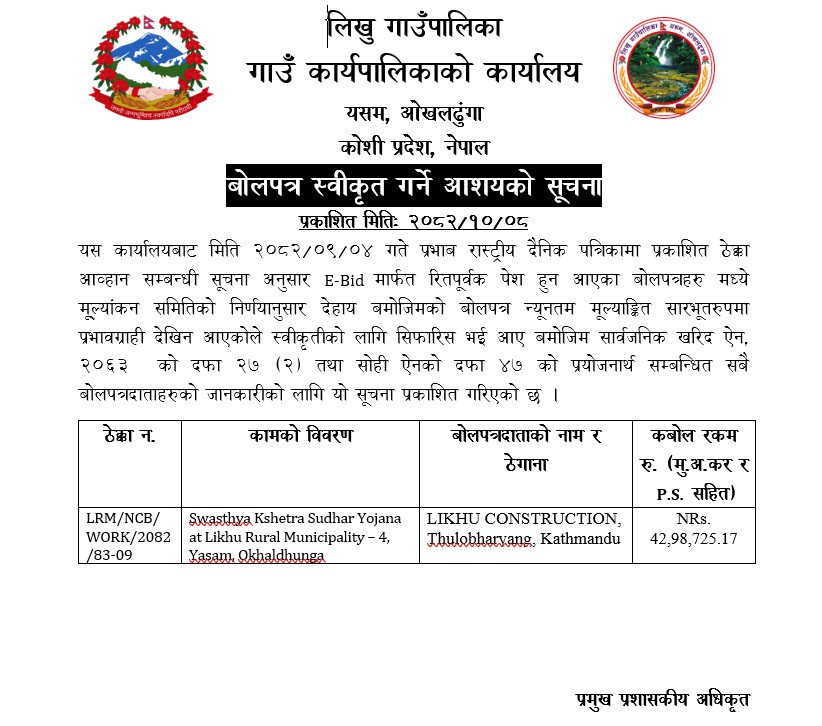 बोलपत्र स्वीकृत गर्ने आशयको सूचना !!!