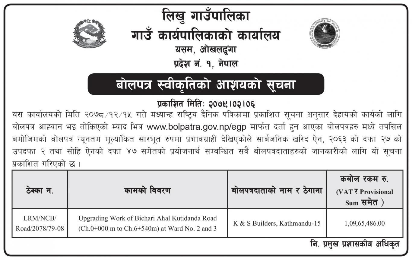 बोलपत्र स्वीकृत गर्ने सम्बन्धी आसयको सूचना ।