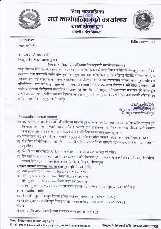 भलिबल प्रतियोगितामा टिम सहभागि गराउने सम्बन्धमा (वडा कार्यालय सबै, लिखु गाउँपालिका, ओखलढुंगा )