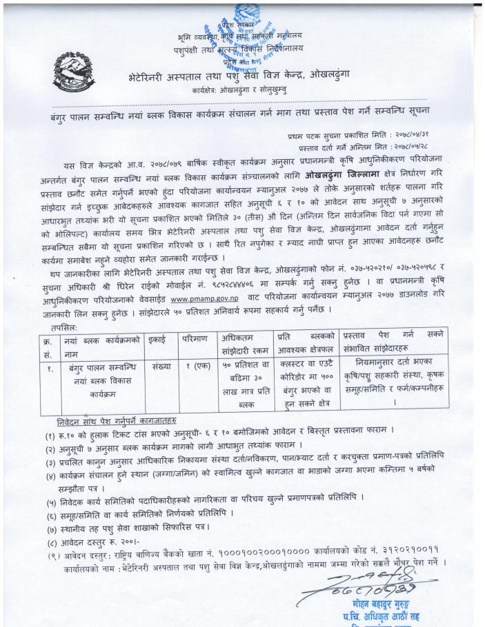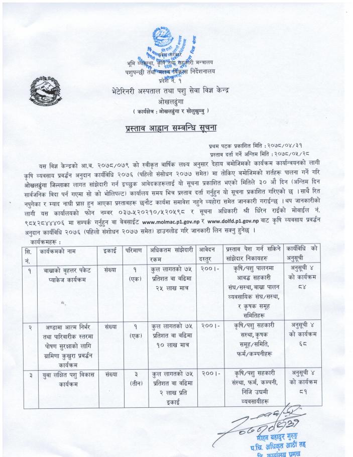 भेटेनरी अस्पताल तथा पशु विज्ञ केन्द्र ओखलढुंगाको प्रस्ताव आव्हान सम्बन्धी सूचना ।