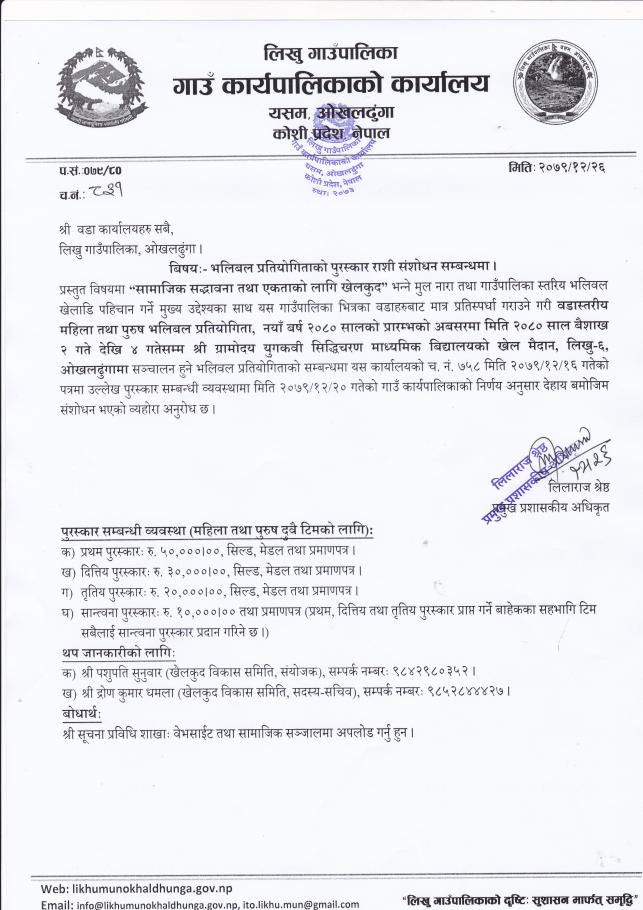 » वडास्तरीय महिला तथा पुरुष भलिबल प्रतियोगिताको पुरस्कार राशी संशोधन सम्बन्धमा ।