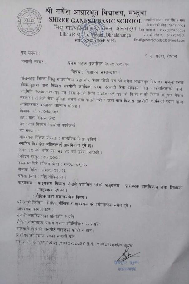 » शिक्षक आवश्यकता सम्बन्धी सूचना (गणेश आ.वि.)