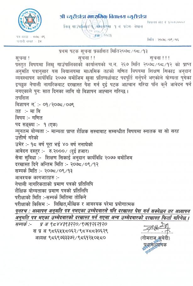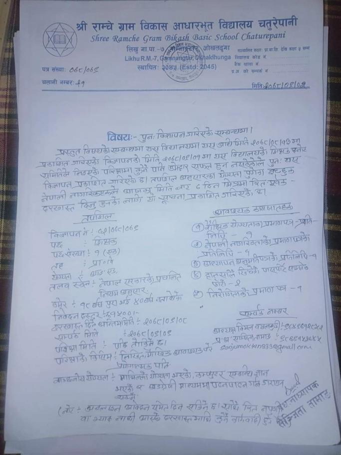 » शिक्षक आवश्यकता सम्बन्धी सूचना (लाम्रांग आ.वि., च्युरीडाँडा मा.वि. र राम्चे ग्रामविकास आ.वि.)