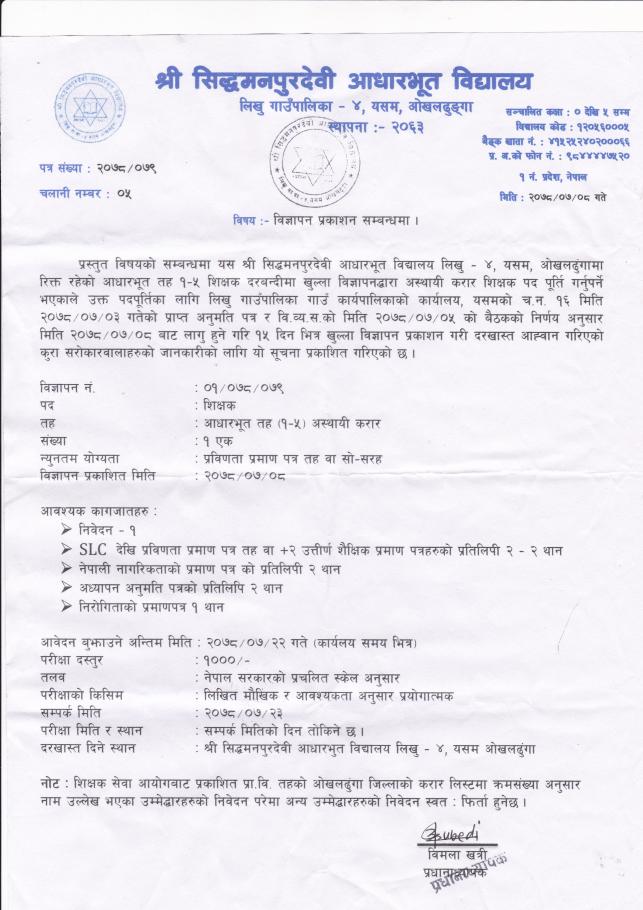 सिद्धमनपुर आधारभूत बिद्यालयको शिक्षक आवश्यकता सम्बन्धी सूचना ।