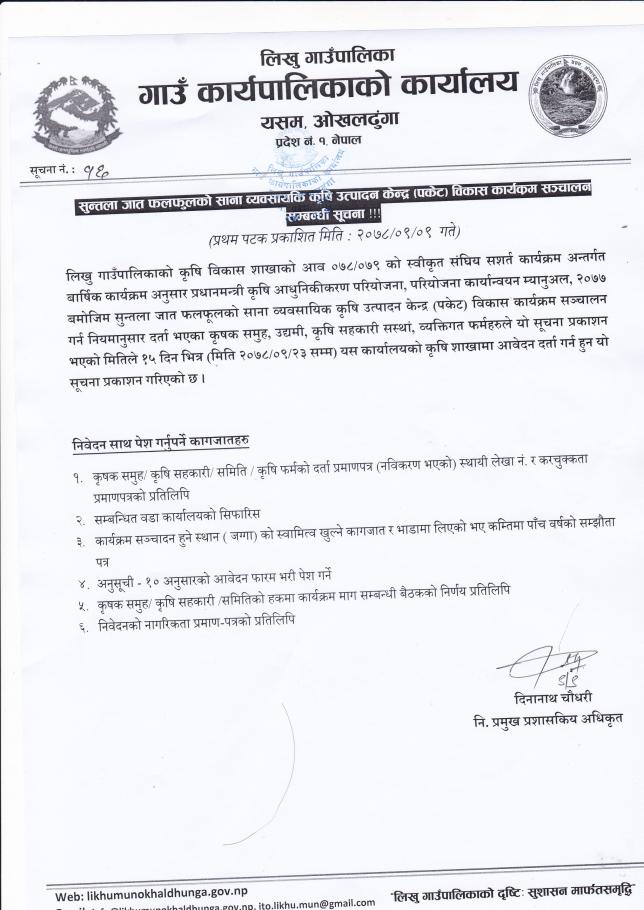 सुन्तला जात फलफुलको साना व्यवसायीक कृषि उत्पादन केन्द्र (पकेट) विकास कार्यक्रम सञ्चालन सम्बन्धी सूचना ।