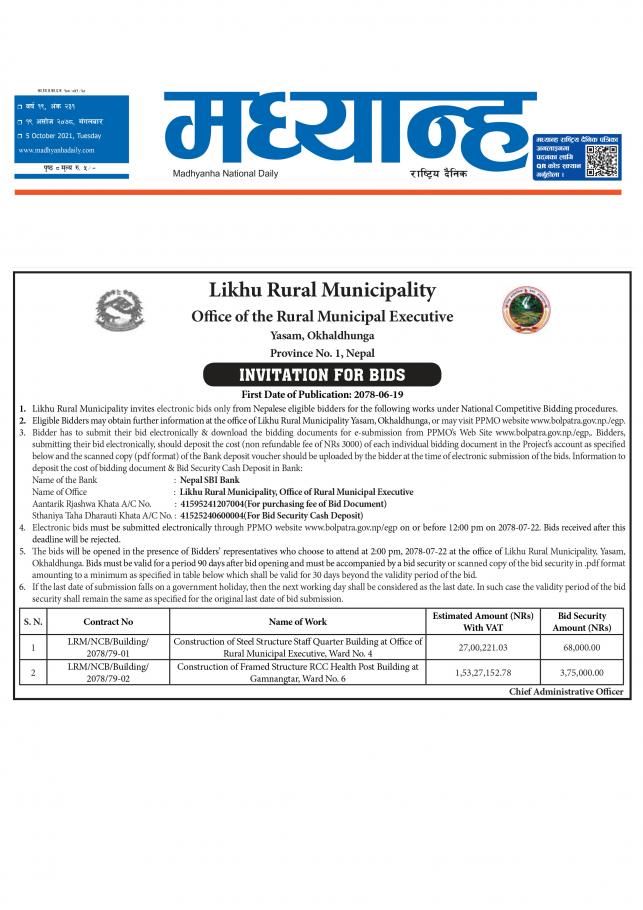 Invitation of Bid for the Construction of Health Post Building and Staff Quatar