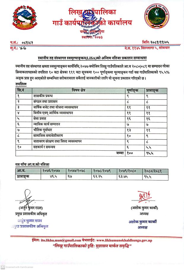 लिखु गाउँपालिकाको आ.व. २०८०/०८१ को संस्थागत क्षमता स्वमूल्याङ्कन (LISA) मा ९५.५ अङ्क प्राप्त गरेको छ। गत आर्थिक वर्षमा ६३.७५ प्राप्त गरेकोमा यस वर्ष कार्यसम्पादन लगायतका क्षेत्रमा सुधार गर्दै लिखु गाउँपालिकाले ओखलढुङ्गामा रहेका ८ वटा पालिकाहरु मध्ये सबैभन्दा उच्च अङ्क प्राप्त गरेको हो ।